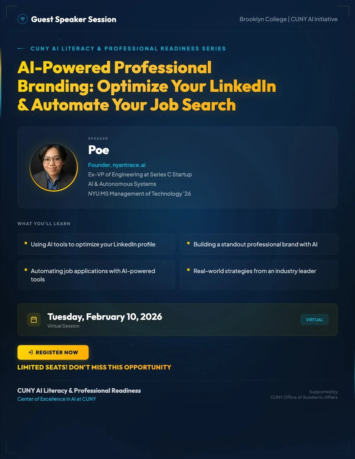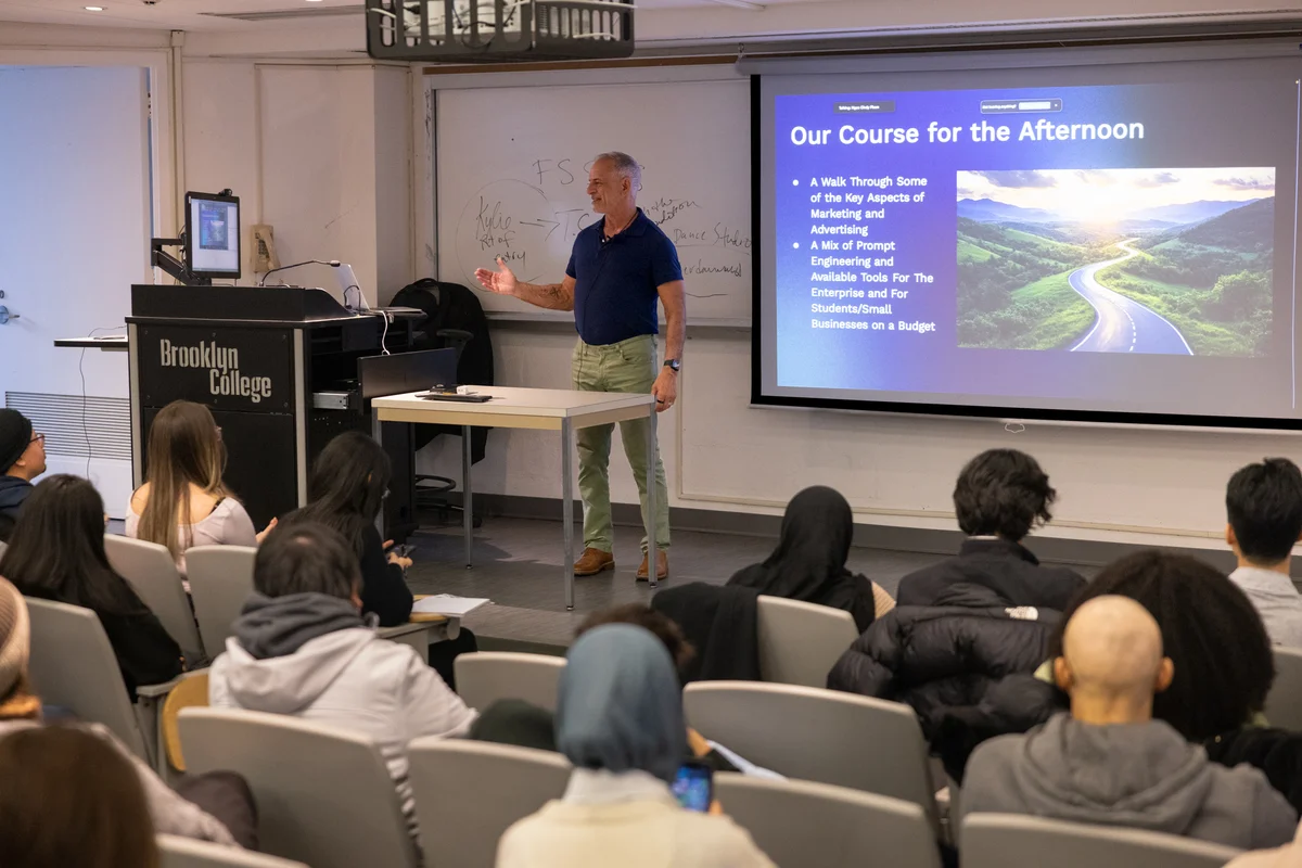 Supported by a grant from the CUNY AI Innovation Fund through the Office of Academic Innovation (CUNY Office of Academic Affairs), the series equips CUNY students with practical, ethical, and career-ready AI skills. The program brings together students from Brooklyn College, other CUNY campuses, and NYU Tandon School of Engineering through hands-on, industry-informed sessions that connect classroom learning with real-world applications in business, research, and career development.